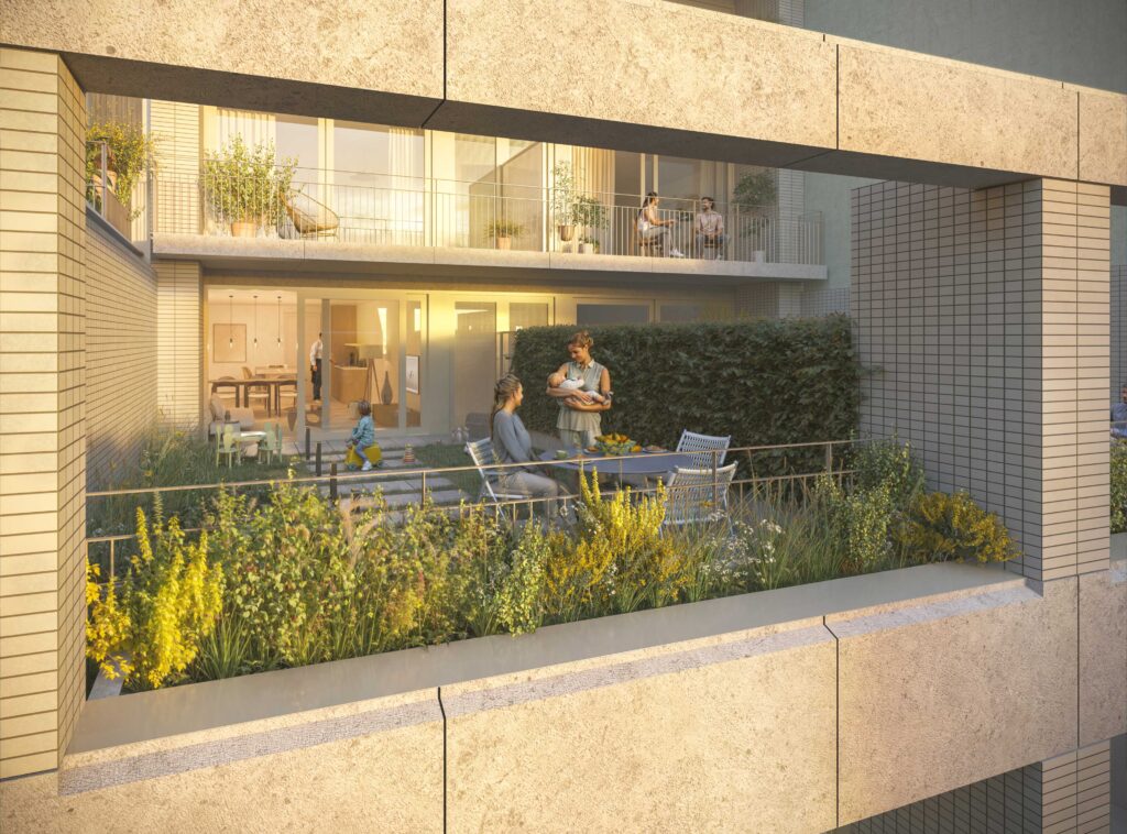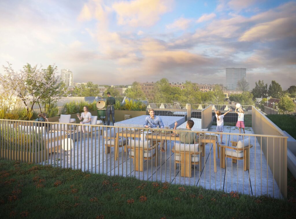 Elke woning beschikt over een eigen buitenruimte: een balkon, terras of royaal dakterras. Daarnaast ligt er tussen de gebouwen een groene, gedeelde binnentuin – een fijne plek om even buiten te zijn of buren te ontmoeten. Plus: fietsparkeergemak, want elke appartementbewoner parkeert zijn of haar fiets in de centrale Bike Hub.